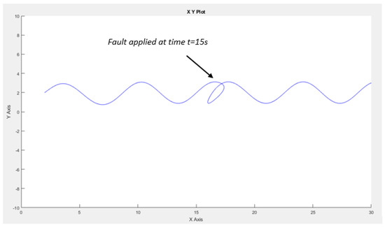 The fault scenario addressed involves an offset applied to the x measurement at the 15 s mark. Subsequently, we applied our Extended Kalman Filter (EKF), and the resulting robot trajectory is illustrated in Figure 16.