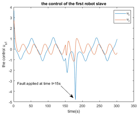 In the preceding section, the system (consisting of a robot master and slaves) executes its trajectory within an ideal environment. However, real-world environments lack such ideal conditions. Thus, we aimed to introduce a fault and observe how the system responds to the challenge. Indeed, the multi-robot system under fault is described in the following figure (see Figure 18). It was observed that the robot master adheres to its trajectory, as depicted in Figure 3.