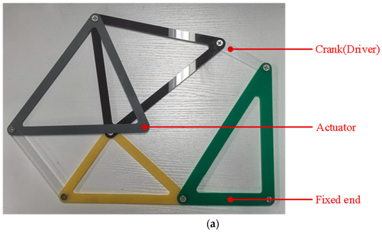Figure 11 shows a testing machine built based on the optimal parameters of the Watt-I six-bar mechanism. The bar group is made of acrylic material, installed with sliding friction bearings in its joint part; the upper right corner is the execution end Link 1, and the gray triangle bar is the extension bar.