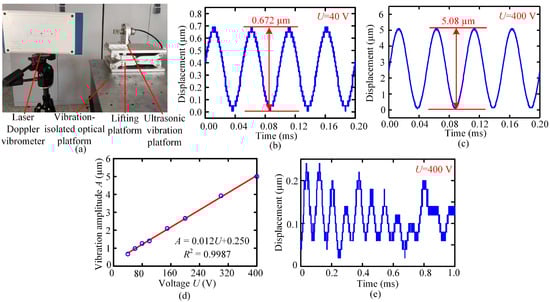 - The ultrasonic vibration platform could generate stable ultrasonic vibration at a frequency of 20 kHz within the amplitude range from 0.73 µm to 5.08 µm. The vibration amplitude had a good linear relationship with the excitation voltage.