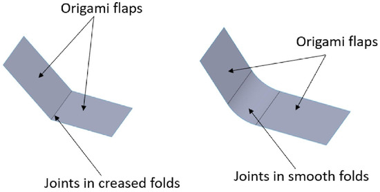 In origami-based designs, the folds function as joints, categorized into two types: creased folds and smooth folds [32]. Creased folds act as hinges, represented by straight lines without occupying any area. Smooth folds involve bending a portion of the paper, as shown in Figure 1, with the middle part of the origami structure serving as the bending joint. There are two types of folding directions: mountain folds and valley folds [32]. Mountain folds enter the plane of the paper. Valley folds come out of the plane of the paper.