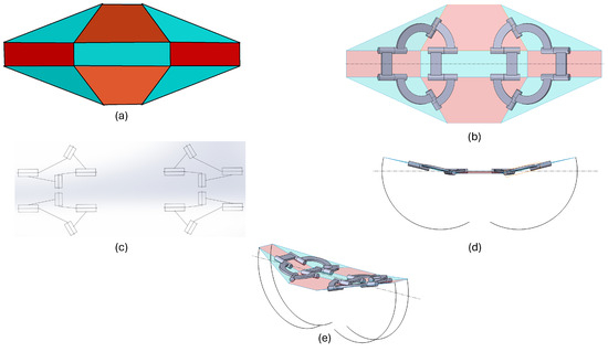 Pattern 2 has the same-sized rectangular flaps. Each rectangular flap is joined with the adjacent rectangle flaps by two triangular flaps. Each hexagon vertex is the center of a spherical five-bar mechanism as five edges meet at a vertex. Each flap is independent and requires six actuators to actuate each of the six flaps and has six degrees of freedom. The gripping action of the type 2 structure is illustrated as well. Here, all six flaps come together to grip the target object. The structure can actuate to the point where the triangular flaps become collinear. Once the triangular flaps become collinear, the structure is locked and cannot grip further (Figure 17). The gripping motion of the type 1 and type 2 patterns, in the right of Figure 16, is shown in the Figure 17.