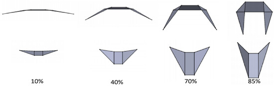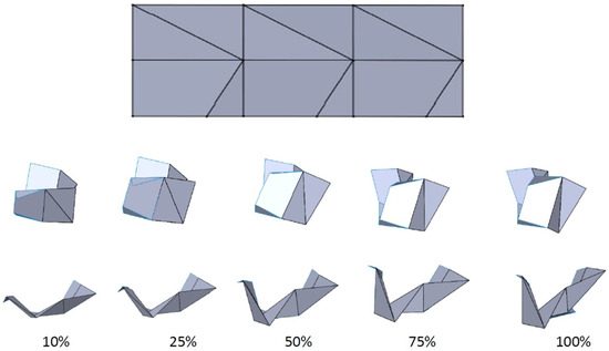 Miura origami can be modeled as a branch of spherical four-bar mechanisms in series, forming a 1-DOF mechanism. The motion of the Miura ori is represented in phases as shown in Figure 8.
