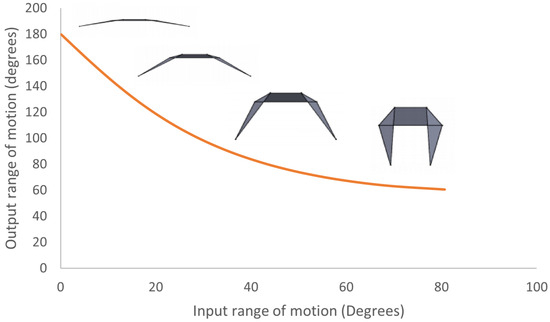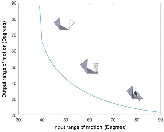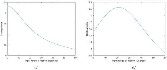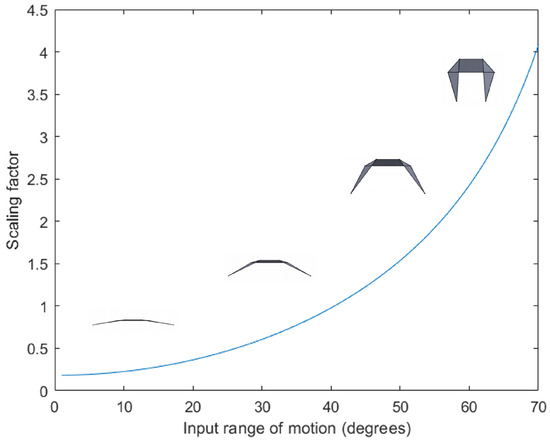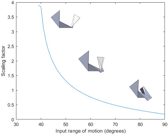 where and are shown in Figure 5. The variation of the scaling factor with the input angle of actuation for at sixty degrees is shown in Figure 7.