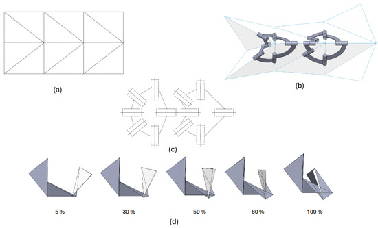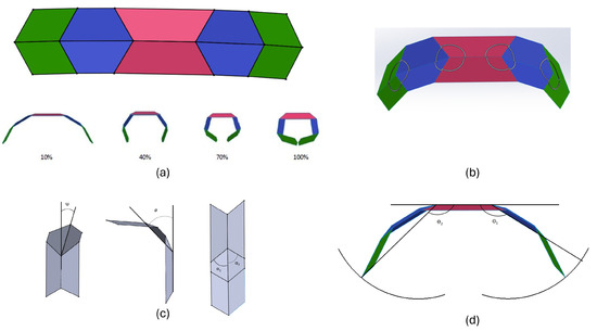 Origami-based mechanisms have a wide range of applications [10,11]. Miura ori and its similar structures are used as unmanned aerial vehicles (UAVs) and finger exoskeletons [12]. Origami structures are also used to develop flexible solar panels. The spherical mechanisms from origami modeling have been used to open car doors [13]. Origami structures have been developed that can mimic the motion of umbrellas [14]. Origami structures with single and multiple degrees of freedom can be used as deployable arms [15,16,17]. The structures are used as tiny hands capable of twisting and gripping various objects [18]. With soft robotic structures [19,20], origami actuation can behave like elevator platforms [21]. Variations of origami structures are used as jumping robots by controlling and regulating their inherent compliance [22]. Origami mechanisms using peristaltic gait [23] produce flipping and snapping motions. Origami also plays a significant role in the field of biomedical engineering, such as surgical retractors for tissue interaction [24] and the magnetic resonance imaging of joints [25]. Its application as a grasper can aid in surgeries [26]. A MACIOR can mimic a caterpillar-based gait [27]. Origami structures have been used for wireless communication between different robots [28]. Buildings have origami-based modeling to share an architectural aspect [3].