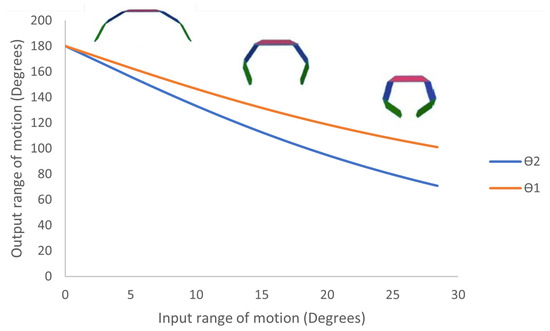 The variation of the output range of motion and with the input range of motion, all measured in degrees. For an angle of thirty degrees of input, the end effector reaches its final position.