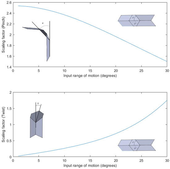 The variation of scaling factor along the pinch and twist directions with input range of motion. The scaling factor decreases in the pinch motion with actuation but increases in the twist direction.