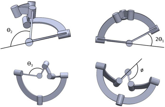 where is the rotation of the joint, where is , is , and is the fixed rotation corresponding to the joint at Z, with being and being . Solving this according to [23], the final relation relating the several parameters of the 6R mechanism is as follows.
