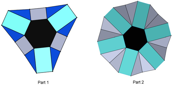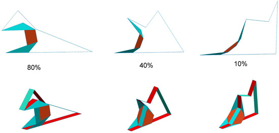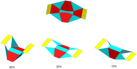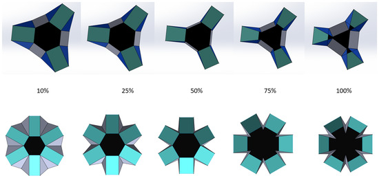 MACIORs can also have an asymmetric structure with distinct angles, namely and . The asymmetric structure can lead to twisting motions like Miura ori and other motions depending on the fixed parameters. A flat layout of an asymmetric MACIOR is shown in Figure 15. The side view and top view of the twisting motion of an asymmetric MACIOR are also presented in Figure 15. It indicates that a MACIOR can be used for twisting and wrapping purposes. The six-degree vertex of the MACIOR can generate a myriad of motions that can be chosen by fixing any angles by the user according to convenience and avoiding any toggle points and singularities.