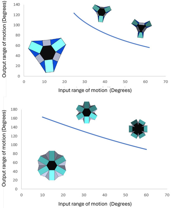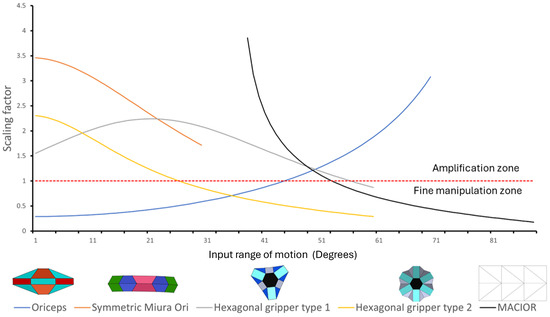 Figure 21 compares the scaling factor of the different origami structures. Different structures have different angles that lead to the final position. Hence, each line ends at different angles of actuation. From Figure 21, we see the variation of the scaling factors of all of the origami structures that have been discussed so far, plotted with respect to the input angle of actuation. Broadly, the workspace can be classified into a binary, namely the amplification zone and the fine manipulation zone. The former consists of regions where the scaling factor is higher than one, while the latter is the opposite, where the scaling factor is less than one. This can prove to be an important factor in making a selection of a particular structure family, given the application and other parameters like the geometry of the object being gripped.