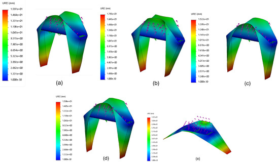 A simulation of the deflection of folding the oriceps upon application of the same input with five different classes of materials to illustrate the effect of material properties on reducing the compliant scaling factor. (a) is ABS plastic, (b) is Nylon 101, (c) is PET plastic, (d) is PVC rigid, and (e) is titanium alloy.