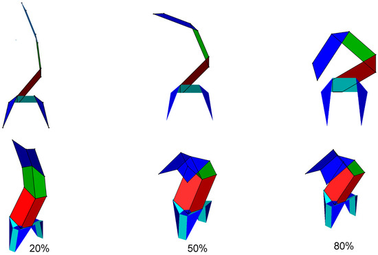 From the figure, different models tend to grip in different ways for the same input, as the material’s stiffness plays a vital role in folding an origami. Nylon 101 in Figure 22 showed maximum displacement, and titanium alloy, Figure 22, showed the least displacement of all. This gives us a fair insight into the class of materials to grasp. Therefore, nylon shows the least deviation of the scaling factor from the rigid model scaling factor of the structures.