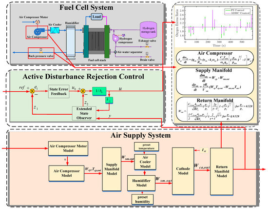 Based on this, the research framework of this paper is shown in Figure 1. In this paper, a nonlinear ADRC method is proposed to improved robustness and stable control of the OER within the optimal range for enhanced control effectiveness. Conventional linear control methods face challenges in dealing with the nonlinear characteristics of fuel cells, necessitating the adoption of a more suitable approach. The ADRC method, which incorporates error feedback and effectively estimates disturbances in the system, is utilized as a more direct and effective control system for the air supply subsystem. The performance and robustness of the control strategy is verified by comparing the ADRC strategy with the PI control strategy. Models of the PEMFC and its controller are developed and simulated to validate the effectiveness of the proposed control method. The main contributions of this paper are summarized below: