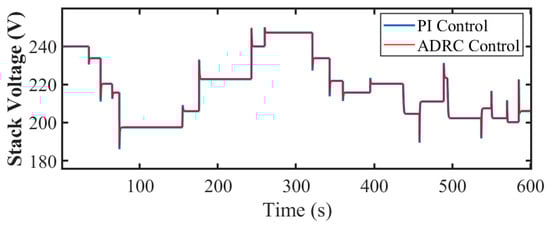 PI-controlled and ADRC-controlled fuel cell stack voltage curves.