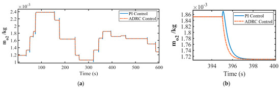 Simulation results of PI control and ADRC: (a) oxygen mass observation curve; (b) oxygen mass observation curve local zoomed in.
