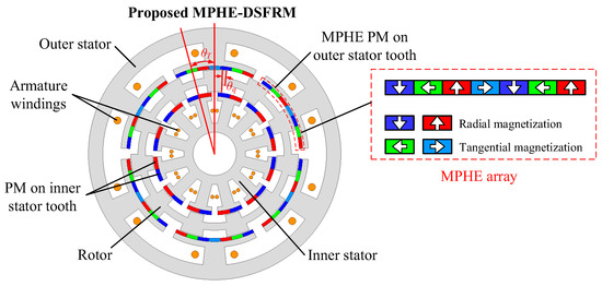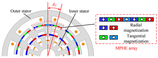 Figure 1 shows the configuration of the proposed MPHE-DSFRM, in which the rotor is sandwiched by the outer and inner stator. The proposed MPHE-DSFRM can be considered as an external FRM with four poles PMs on each stator tooth, and an internal FRM with two poles PMs on each stator tooth. Based on the pole/slot combination, outer and inner stators use six stator slots and twelve stator slots when having the same pole pair number (PPN) of PMs, respectively. The Halbach array is employed to reduce leakage flux, improve PM utilization, and reduce the torque ripple of the machine [34,35]. High torque density can be obtained by optimizing the positions of the two stators (θT) and the angle difference between the width of inner and outer salient rotor poles (θq). The relationship between the number of rotor salient poles, the PPN of stator PM, and the armature reaction follows the field modulation theory.