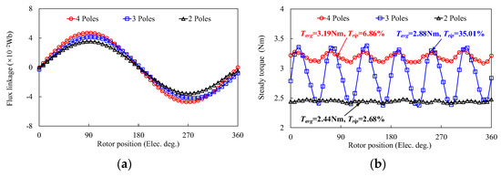 Comparison of FRM with different poles of PMs on one stator tooth. (a) Flux linkage waveforms. (b) Steady torque waveforms.