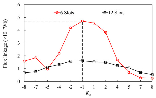 The Ka may be negative when Zr ≤ Ps, which has the range from −8 to 8. It can be seen that the amplitude of flux linkage of the six-slot winding configuration is higher than that of the twelve-slot winding configuration when −4 ≤ Ka ≤ 4. Additionally, the structure with fewer Zr has better performance than that with more Zr when the absolute value of Ka is the same. The amplitude of flux linkage decreases dramatically when Zr ≥ 16 for the six-slot winding, and Zr ≥ 29 for twelve-slot winding, which is mainly due to significant flux leakage. To obtain a higher back-EMF and a superior flux-modulated effect, the FRM with four poles of PMs on one stator tooth and Ns = 6, Zr = 11 can be designed. It should be noted that the six-slot stator is designed to keep the same PPN of PMs after employing four poles of PM on one stator tooth.