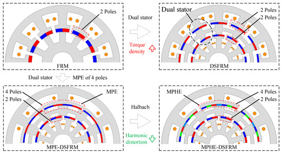 Figure 5 shows the evolution process of the proposed MPHE-DSFRM from the conventional FRM. DSFRM can be designed after employing dual-stator structure, which has the merits of high torque density and high space utilization. The DSFRM has inner and outer stators and double-layer salient poles in the rotor, which can be considered as external and internal FRMs. To further enhance the torque density, four poles of PMs on one stator tooth can be introduced, which forms the MPE-DSFRM with Ns = 6 in external FRM, and Ns = 12 in internal FRM. In order to further enhance torque density, reduce torque ripple, and suppress risk of magnetic saturation, a Halbach array is employed on the outer stator to achieve both merits of high torque density and low harmonic distortion.
