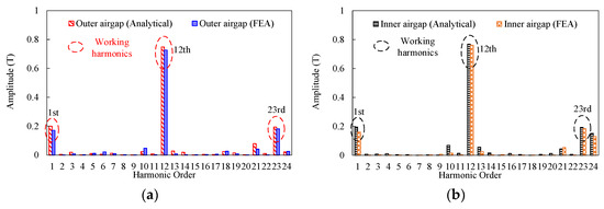Harmonic spectra of airgap flux density at no-load state. (a) Outer airgap. (b) Inner airgap.