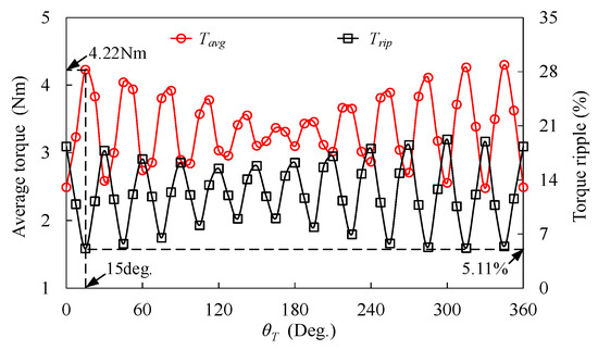 Figure 7 shows the definition of the position between the inner and outer stator teeth (θT), and the variations of Tavg and Trip, which are depicted in Figure 8. It can be seen that the Tavg has a decreasing trend, while the Trip has an increasing trend against θT. The highest TQ can be achieved with the highest Tavg and the lowest Trip when θT = 15 deg, which means that, for MPHE-DSFRM, the outer stator tooth should be opposite to the slot between the two stator teeth of the inner stator.