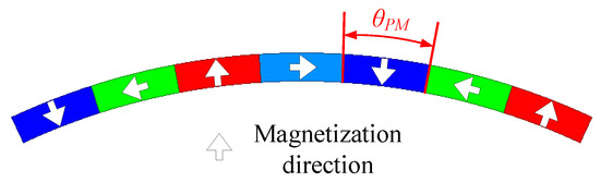 - Wang, H.; Xu, W.; Xu, Y.; He, C. Design and analysis of permanent magnet machines with multiple arc pole ratios in stator teeth. IEEE Trans. Energy Convers. 2024, 39, 1278–1287. [Google Scholar] [CrossRef]