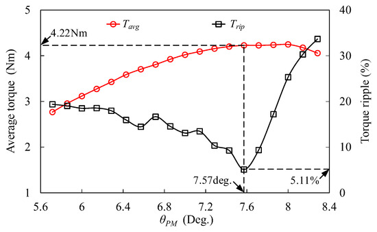 Figure 9 shows the definition of the width of the stator PM (θPM), and the variations of Tavg and Trip against θPM are depicted in Figure 10. The Tavg increases with θPM, which means that wider PMs can achieve a higher torque value due to PMs establishing the main magnetic flux. The Trip has significant fluctuation with increasing θT, and the lowest Trip can be obtained when θPM = 7.57 deg. Considering achieving a high TQ, θPM = 7.57 deg is the optimal width of stator PM in MPHE-DSFRM.