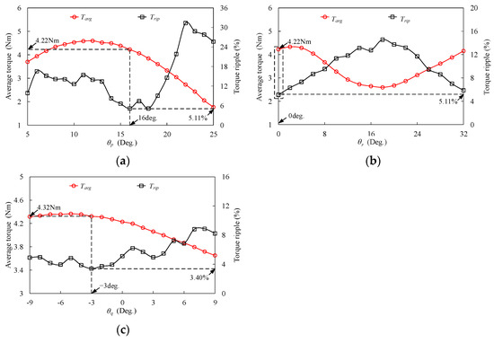 The definition of design parameters for rotor are shown in Figure 11, which includes the width of the salient pole (θp), the position between the outer and inner teeth on the rotor (θr), and the angle difference between the outer and inner teeth on the rotor (θq). The variations of Tavg and Trip for these parameters are presented in Figure 12. It can be seen that high Tavg and low Trip can be achieved when θp = 16 deg, θr = 0 deg, and θq = −3 deg. The results indicate that for MPHE-DSFRM, the outer and inner salient poles should have the same position on the rotor. Furthermore, a higher torque can be obtained when the width of the inner salient pole is smaller than that of the outer salient pole on the rotor.