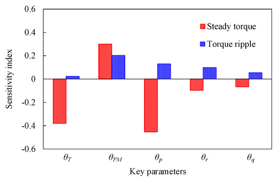 where |Savg(yi)| and |Srip(yi)| are the absolute value of the sensitivity index of Tavg and Trip, respectively. λ1 and λ2 are the weight coefficient of |Savg(yi)| and |Srip(yi)|, respectively. The sensitivity judgments of these parameters are shown in Table 2, which shows that θT, θPM, and θp have more significant influences than θr and θq when considering both the Tavg and Trip. Therefore, θT, θPM, and θp should be given priority consideration to achieve high torque quality during the design process of the proposed MPHE-DSFRM.