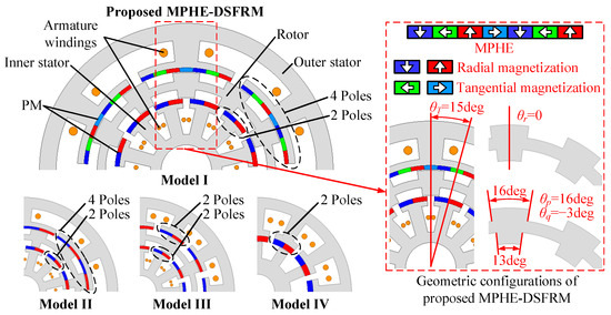 Based on the optimized key parameters, MPHE-DSFRM, MPE-DSFRM, DSFRM, and conventional FRM are designed, which are simply referred to as Models I, II, III, and IV, respectively. The geometric configurations and key design parameters are shown in Figure 14 and Table 3. For a fair comparison, these four models share the same key design parameters, i.e., stack length, outer diameter of outer stators, the inner and outer airgap lengths, and PM volume.