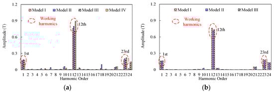 The airgap flux densities and corresponding harmonics spectra at the no-load state of these four investigated models are shown in Figure 15. The stators of the four models employ twelve PPNs of PM excitation, one PPN of armature reaction, and eleven rotor salient poles. According to the field modulation theory, working harmonics includes the first (n = 1, m = −1), the twelfth (n = 1, m = 0), and the twenty-third (n = 1, m = 1) order harmonic components in the airgap. The amplitudes of working harmonic components of Models I and II are higher than those of Model III. Therefore, it can be deduced that Models I and II with MPE provide a higher output of torque when compared to Model III. It should be noted that Models I, II, and III can have a higher torque output compared to Model IV, which is mainly due to the higher total airgap flux density by two airgaps. Furthermore, the amplitude of the seventh and eighteenth harmonics (useless order harmonic) of Model II are higher than those of Model I. This indicates that Model I can suppress harmonic distortion with the employment of MPHE.