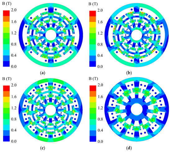 Figure 16 depicts the magnetic field distribution of four investigated models at a no-load state. It can be seen that the maximum value of flux density in these four models is 2.0 T, which is below the magnetic saturation threshold of silicon steel. The flux densities of Models I, II, and III are higher than those of Model IV, which is mainly due to the capacity for improving magnetic field distribution by dual-stator structure. The flux densities at the junction of PM and stator teeth of Model I are lower than those of Model II, which shows a higher ability by Halbach to avoid magnetic leakage. It should be noted that there are no magnetic saturation risks in these four models [13].