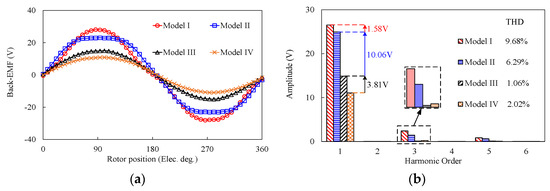 Figure 17 depicts the waveforms and corresponding harmonic spectra of back-EMF in these four investigated models under no-load condition. From Figure 17b, Model I has the highest back-EMF fundamental amplitude in four models. The back-EMF fundamental amplitudes of Models I and II are higher than those of Models III and IV, which agree with the analysis of airgap flux density. It indicates that the back-EMF amplitude can be effectively enhanced when MPE is employed on the outer stator. The total harmonic distortion (THD) of back-EMF of Models I and II are 9.68% and 6.29%, which are higher than those of Models III and IV due to the high amplitude of the third order harmonic. The results show that the proposed MPHE-DSFRM can offer high back-EMF, but have a lower ability to suppress the THD of back-EMF compared to conventional FRM.