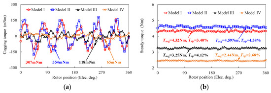 Comparison of torque characteristics of four investigated models. (a) Cogging torque at no-load. (b) Steady torque at rated state.