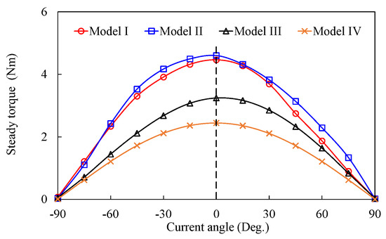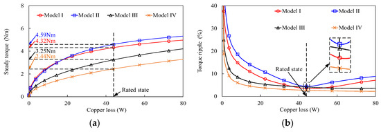 Figure 19 shows the waveforms of Tavg versus the current angle on four models with the rated current applied. The maximum value of Tavg of four models can be achieved when the current angle is 0°. It indicates that an Id = 0 control can be used in the constant-torque region in the four investigated models. With the employment of dual-stator and MPE, the Tavg of Models I and II are higher than those of Models III and IV at each current angle. The steady torques and torque ripples against copper losses for these four models are shown in Figure 20. It can be seen that Models I and II have higher torque values, but higher torque ripples than Models III and IV at almost every one of the copper losses. The analysis about steady torques and torque ripples for these four models agrees with the performance analysis at the no-load state.