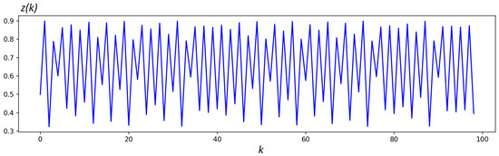 where r is the system’s parameter. Hereafter, we set . A sample of the chaotic trajectory using is shown in Figure 1, where a line joins each data point generated by the logistic map.