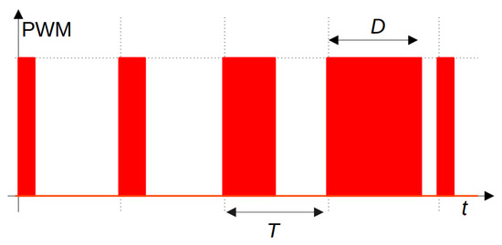For chaotic logistic experimental realization, we will use PWM (pulse-width modulation). This is a technique for obtaining analog results with digital means. This is a well-known technique in electronics. However, a general description of a pulse-width modulation signal, a type of digital signal, can be summarized as follows. In a typical PWM signal, the base period (T) is fixed, while the pulse width (D) is manipulable by the user (see Figure 3). Hence, for example, a 50% duty cycle (D = 0.5) means that the PWM output is high for half the period and zero for the remaining part. Hence, D belongs to the open interval from zero to 1. If we want to implement the chaotic logistic map into a PIC microcontroller of 8 bits, e.g., the PIC16F84A microcontroller, the PWM duty cycle should be from “0” to “255” digital count. Hence, we are required to scale the logistic equation using the following scale transformation , yielding