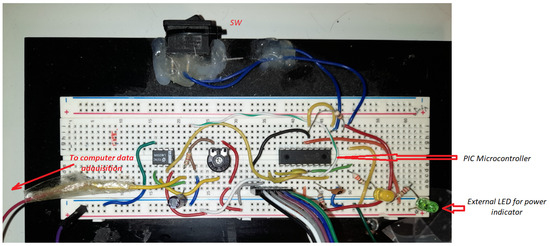 Hence, our PWM duty cycle will be , and the PWM period will be the count of a value bigger than 255. In programming, we use 258. Additionally, . As mentioned above, the duty cycle of PWM lies between the open range of zero to one. Because we are using an 8-bit microcontroller, this duty cycle is mapped to the open interval between zero and 256, see Chapter 6 in [12]. This PMW signal is then sent out of the microcontroller unit followed by an low-pass filter (see Figure 4). The comparator used in the given circuit through an operational amplifier is an analog-to-digital conversion stage before feedback to the microcontroller. The reference of V given by the trimmer is due to the logical threshold level between the 0 and 1 logical values corresponding to 0 V and 5 V, respectively. In this way, the average value at the output of this comparator corresponds to the analog value of (the notations: and = mean defined as) seen by the microcontroller. A photo of the experimental platform is shown in Figure 5.