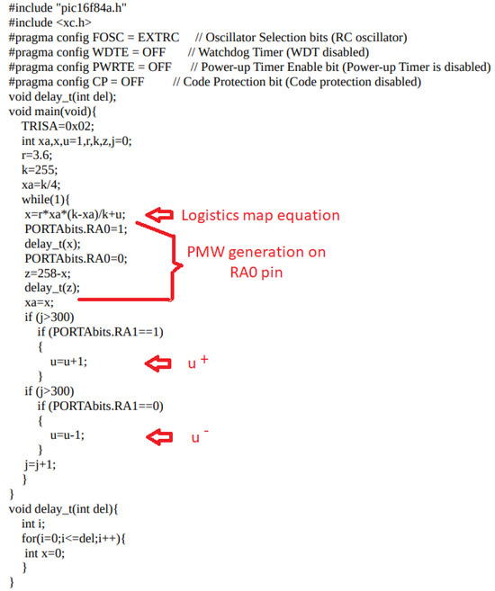 To conclude this section, and due to the used PMW format and the fact the initial and the solution to the chaotic map equation presents positive solutions, from the control law given (8) (or (9)), we can observe that this control action has a negative derivative for the system’s output signal. Therefore, using digital programming in the microcontroller unit, ( the programming line means that the content of register u is increased by one) or ( the programming line means that the content of register u is decreased by one) means positive or negative control variation for the digital control signal to the logistic system, respectively, as shown in Figure 6. In this way, if the time activation of is less than the time activation of , this indicates negative feedback and the asymptotic stability of the closed-loop system. Related to the programming setting or , in mathematical format, these are equivalent to and , respectively.