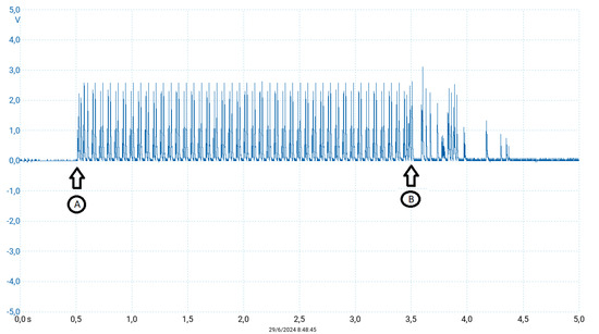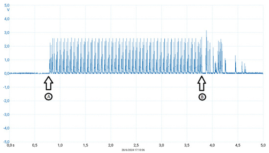Closed−loop response using a stable controller. The horizontal axis presents seconds. At point “A”, the experimental platform is activated for the uncontrolled logistic map, and at point “B”, the control algorithm is activated.