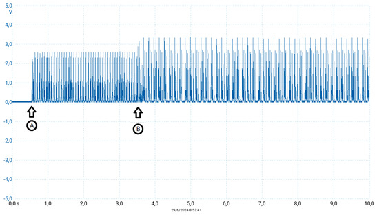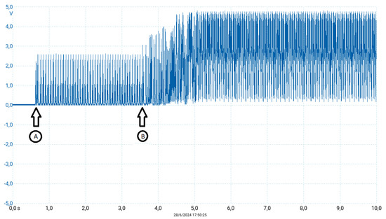 Closed-loop response using an unstable controller. The horizontal axis presents seconds. At point “A”, the experimental platform is activated for the uncontrolled logistic map, and at point “B”, the control algorithm is set to ’on’, as in Figure 8, but with .