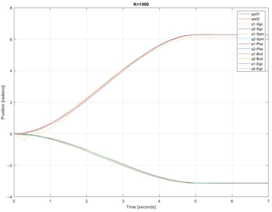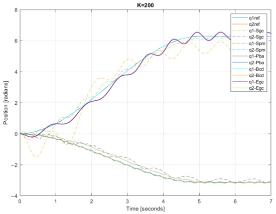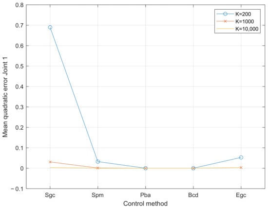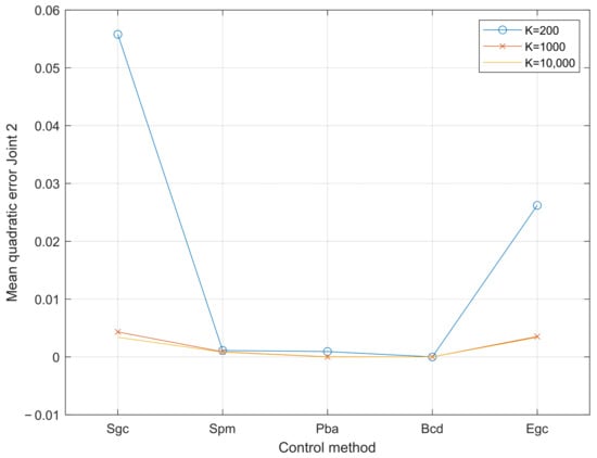 The error in the first joint is one order of magnitude higher than that in the second joint, probably because the higher load carried by the first motor increases the nonlinearities. The error is much higher for K = 200 than for the other cases. The worst results are obtained with Sgc and then Egc. Spb is comparable to the Pba and Bcd for the second joint but not for the first one.