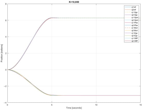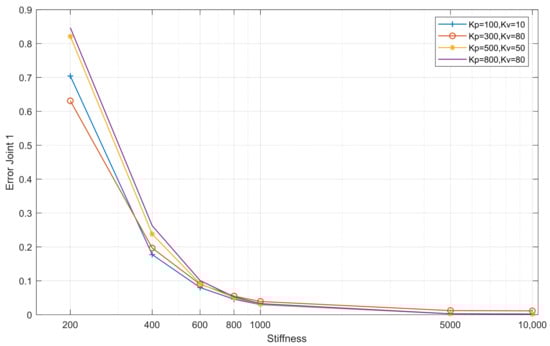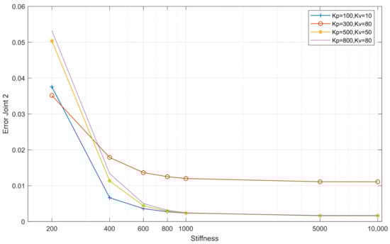 In joint 1, the decreased error is more significant when stiffness increases. The controller gains may provide a minor error, but this is insignificant. For all controllers with low stiffnesses, the system oscillates. When the stiffness value reaches 600–800, the oscillations begin to disappear.