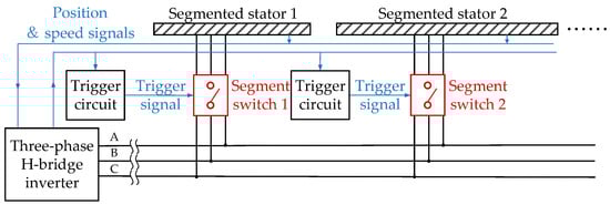 PMLSMs have a high thrust weight ratio, high precision and fast dynamic response [], and have advantages over induction motors in the design of high-power electromagnetic propulsion systems []. In order to solve the problems of high electromagnetic loss caused by excessive phase resistance and inductance under long stroke, the high-capacity requirements of energy storage inverter systems and the low overall operation efficiency caused by large instantaneous driving power, the structure of segmented stators is generally adopted. By dividing the stator winding into several power units, and switching the power supply between sections of the inverter system using the section switch, a better balance of the design cost, operation loss and work efficiency of the electromagnetic propulsion system is achieved [].