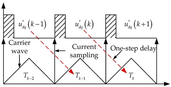 In controllers such as DSP, a one-step delay compensation of DPCC is required due to the delay caused by the PWM modulation link, sampling link, etc. The reference voltage at the th moment should be calculated at the k th moment, i.e., and . The stator current at the th moment is regarded as the reference current at the kth moment, so that the output current tracks the reference current in two control cycles, i.e., and . A timing diagram of DPCC considering delay compensation is shown in Figure 2.