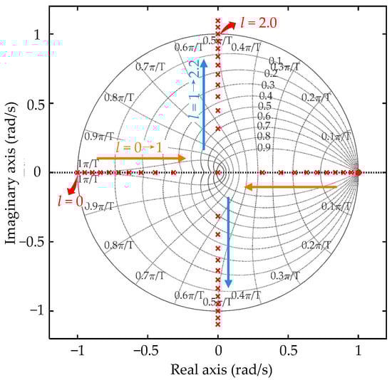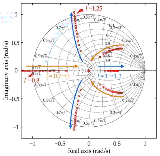In order to stabilize the current loop, poles of the discrete transfer function should lie within the unit circle. Assuming that the inductance mismatch ratio is , which indicates the ratio of the nominal value of the inductance to the true value, it can be used to measure the stability domain of the inductance parameter. Afterwards, the bilinear transformation through the Routh stability criterion can be calculated for the range of values of l under the premise of closed-loop transfer function stabilization: