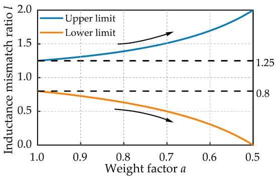 From the stability criterion, it is further calculated that, with the change of the weight factor a, the sufficient and necessary condition for the value of the inductance mismatch ratio l for the stabilization of the current loop transfer function is shown in Equation (19). The trend of the change is shown in Figure 6.