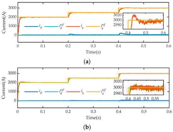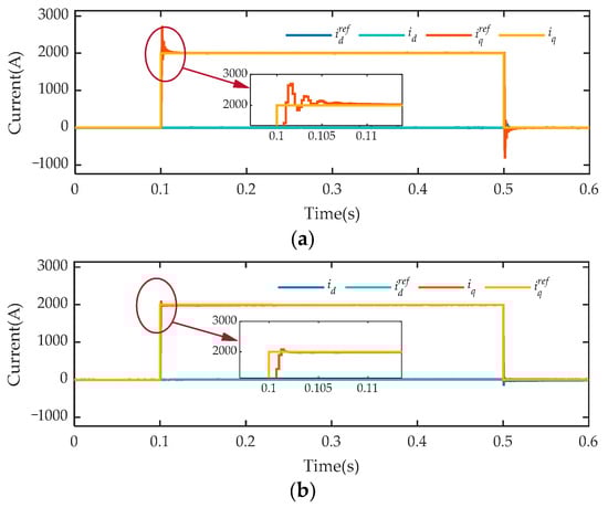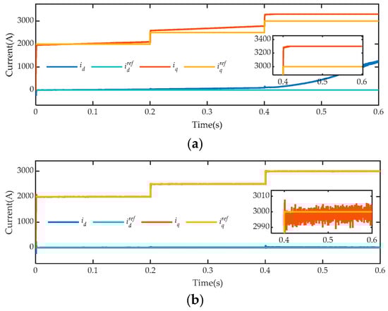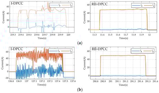 Comparison of the dq-axis currents at . (a) C-DPCC. (b) RII-DPCC.
