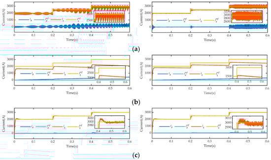 The I-DPCC algorithm is sensitive to delay. When there is no parameter mismatch, the control performance with or without delay compensation is verified by the joint simulation platform. The propulsion system is set to start with a constant q-axis current of 2000 A at 0.1 s, and reduced to 0 at 0.5 s. As shown in Figure 9, when the delay compensation is not considered, the current has a large overshoot at the moment of response. After delay compensation, the overshoot amplitude of the current is reduced by more than 80%, the response is fast and tracking is stable.