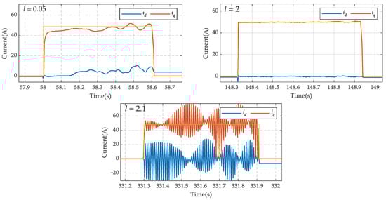The operating conditions in this section are consistent with those in the previous section. The nominal inductance parameters of the model are changed separately to verify the improvement in inductance stability of the I-DPCC algorithm before and after improvement. As shown in Figure 11, the dq-axis currents are obtained when the inductance mismatch reaches the actual stable upper and lower limits of the unimproved I-DPCC algorithm.